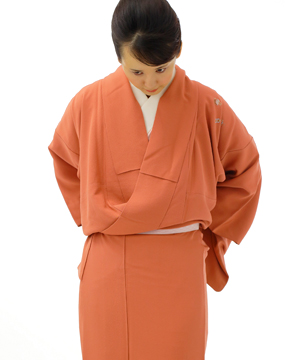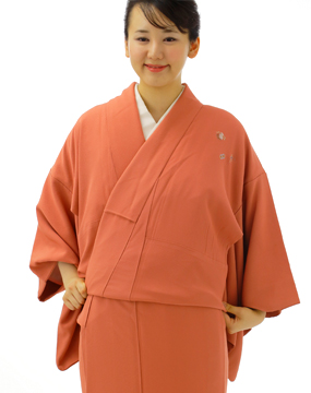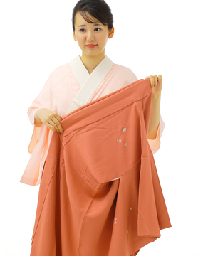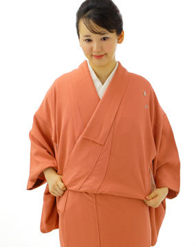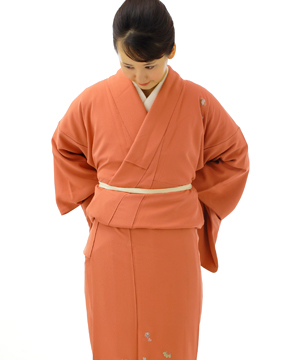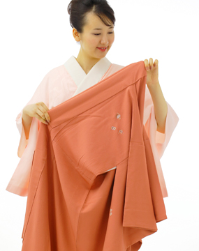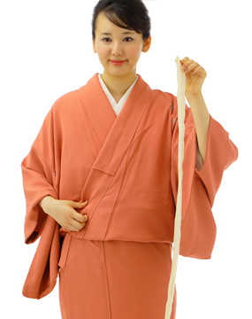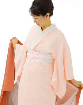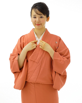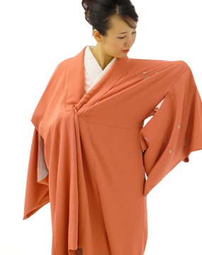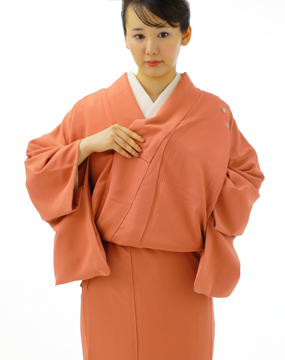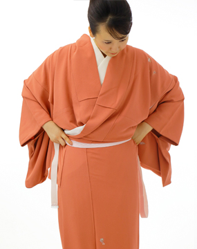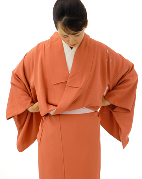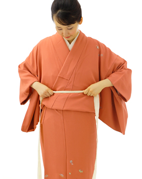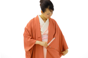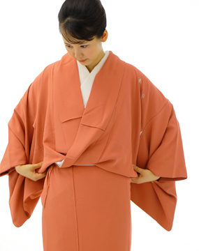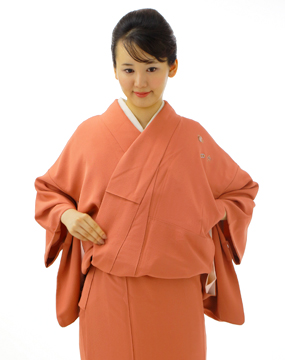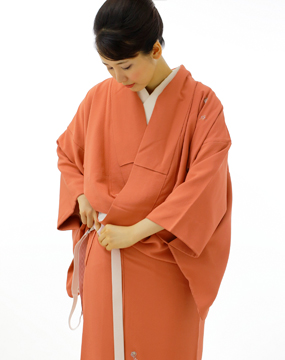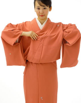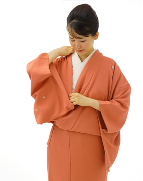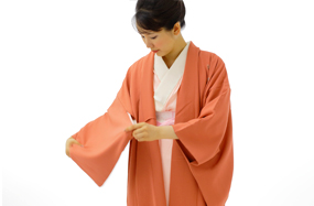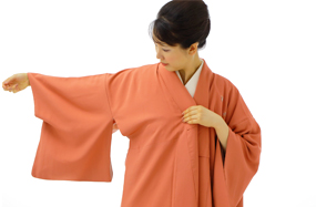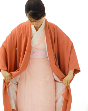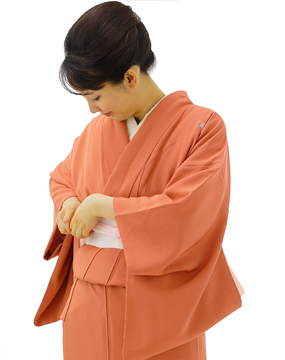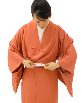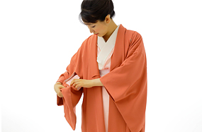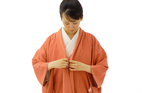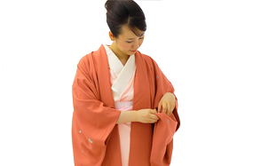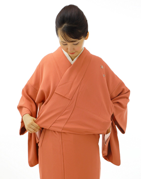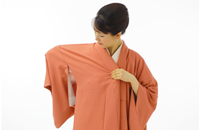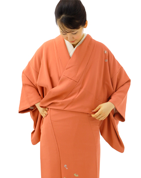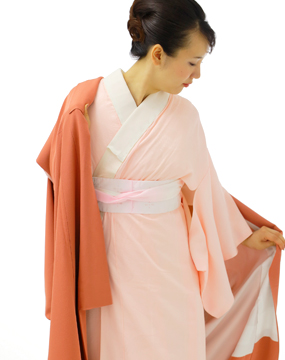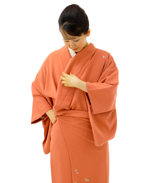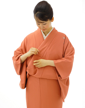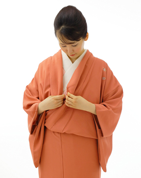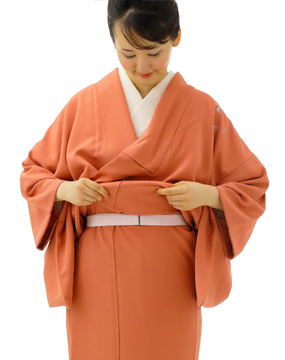 きものを肩からはおり胸元でかけ衿とかけ衿を合わせましょう。