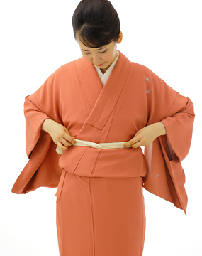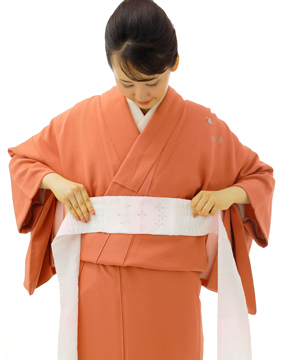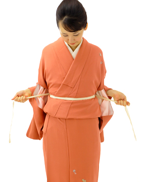 アンダーバストに腰紐をあてきもののしわを伸ばしながら後ろで交差させ、きつすぎない程度に2回かけて左右ひもをねじり、結びましょう。