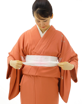伊達締めも前から後ろに回して交差させ、そのまま前に苦しくない程度に締め、体の左側で2回かけ左右にねじって両端を伊達締めにはさんでおきましょう。